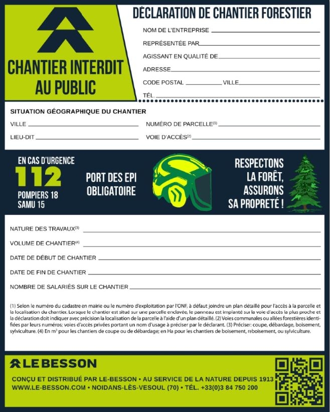 La bâche de déclaration de chantier forestier offre une solution pratique pour signaler vos interventions conformément à la réglementation. Sa grande surface hautement visible informe efficacement le public à distance, limitant les intrusions accidentelles dans les zones de travail. Les œillets renforcés facilitent l'installation sur différents supports disponibles en forêt. Le matériau résistant aux UV et aux intempéries maintient sa lisibilité pendant toute la durée du chantier. Une solution complète pour la sécurité et la conformité réglementaire.