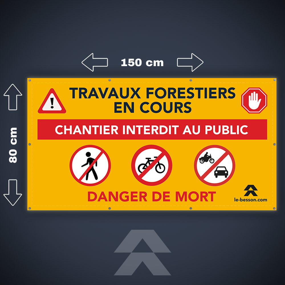 Une bâche de signalisation professionnelle conforme aux exigences ONF pour vos chantiers forestiers. Cette bâche PVC haute résistance 450 grammes garantit une durabilité optimale en conditions extérieures. Œillets renforcés tous les 50 centimètres pour une fixation sécurisée à l'aide de cordes, sangles ou tendeurs standard. Format 150 x 80 centimètres, adapté aux besoins des forestiers. Permet la prévention des accidents, informe du danger et prévient les tiers d'une interdiction de pénétrer sur le chantier forestier.