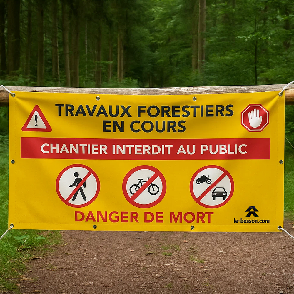 Cette bâche de déclaration "TRAVAUX FORESTIERS EN COURS - CHANTIER INTERDIT AU PUBLIC" répond aux obligations strictes du Cahier National des Prescriptions des Travaux Forestiers (CNPTSF). Indispensable pour tous chantiers de coupe, débardage ou sylviculture, elle évite les contraventions imposées aux exploitants forestiers ne respectant pas la signalisation obligatoire.