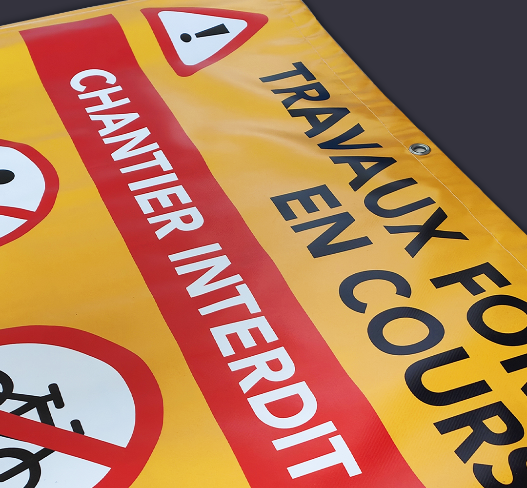 Cette bâche réutilisable sur multiple chantiers représente un investissement rentable face aux sanctions possibles et aux obligations d'assurance RC professionnelle. Conception et fabrication française. Compatible avec l'ensemble des équipements de signalisation temporaire Le Besson pour une gamme complète.