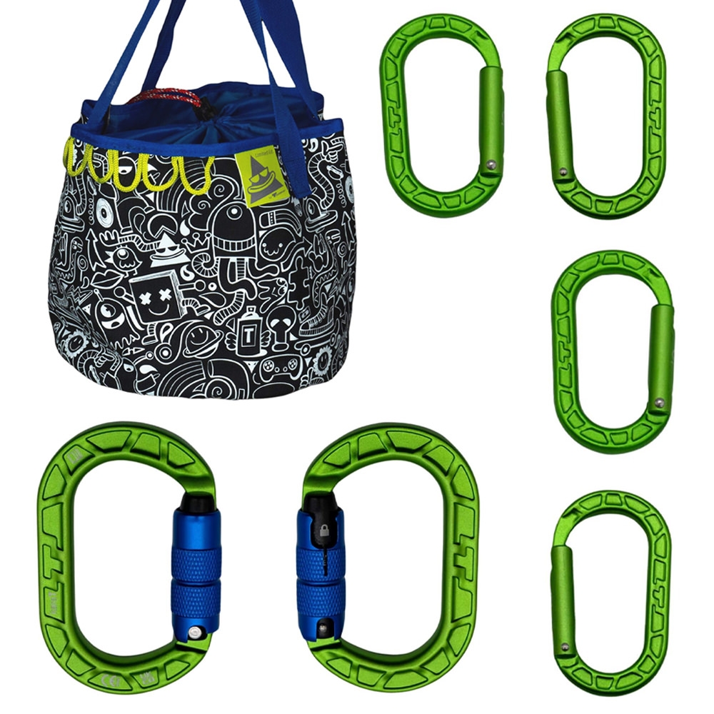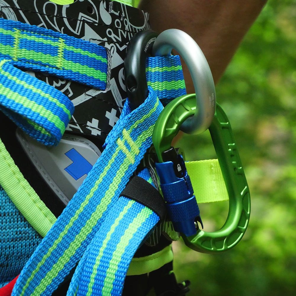 En plus du baudrier treeMOTION Pro édition limitée, vous disposez de 2 mousquetons Kara-T et 4 mousquetons MiniME en édition limitée, compris dans le pack Limited Edition.