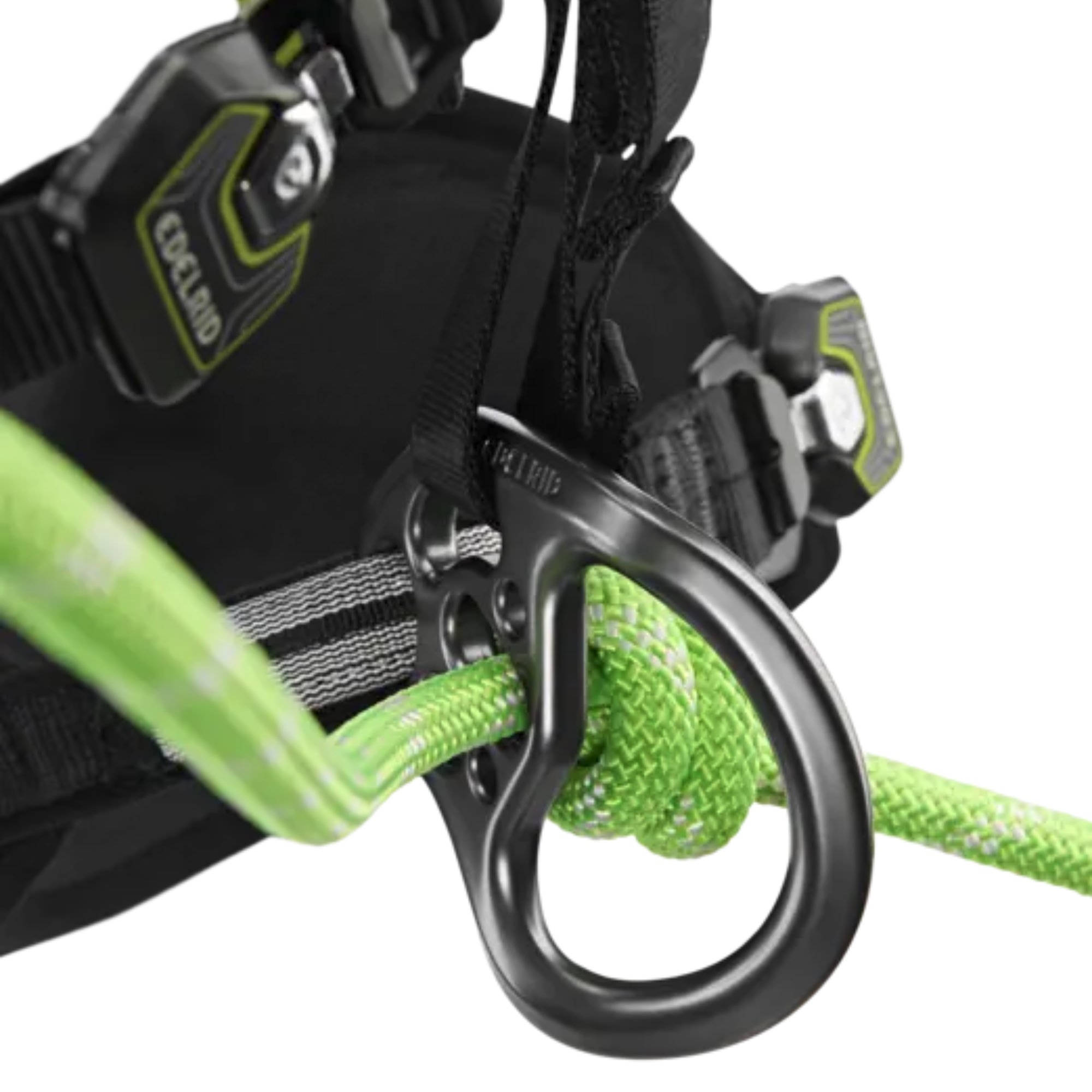 Chaque élément du baudrier est pensé pour un usage intensif : les cuissardes sont munies de protections anti-abrasion en Dyneema et équipées de boucles Double Lock, simplifiant le réglage et le retrait de l’équipement. Les œillets latéraux, ajustables même en tension, permettent une adaptation rapide à la posture de travail, tout en facilitant l’ajout d’un second pont d’attache ou d’un point de maintien.