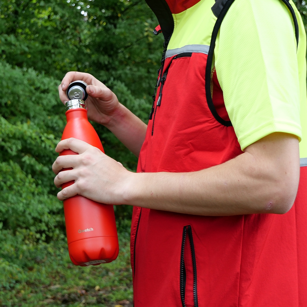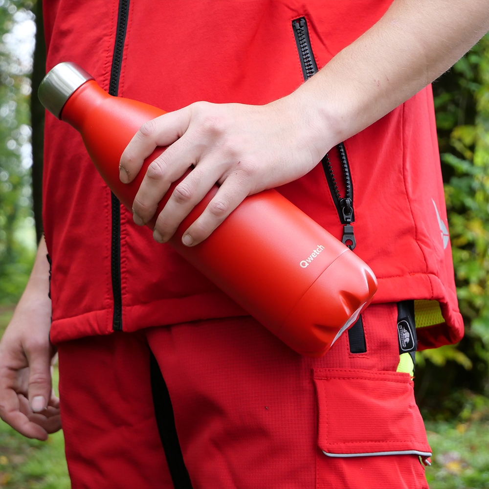 Hydratation et durabilité pour les travaux forestiers. Cette bouteille isotherme QWETCH inox 1L préserve la température de vos boissons jusqu'à 24h (chaud) ou 48h (froid). Sa construction en acier inoxydable 18/8 et son design pratique garantissent robustesse et performances, idéales pour vos longues journées sur chantier.