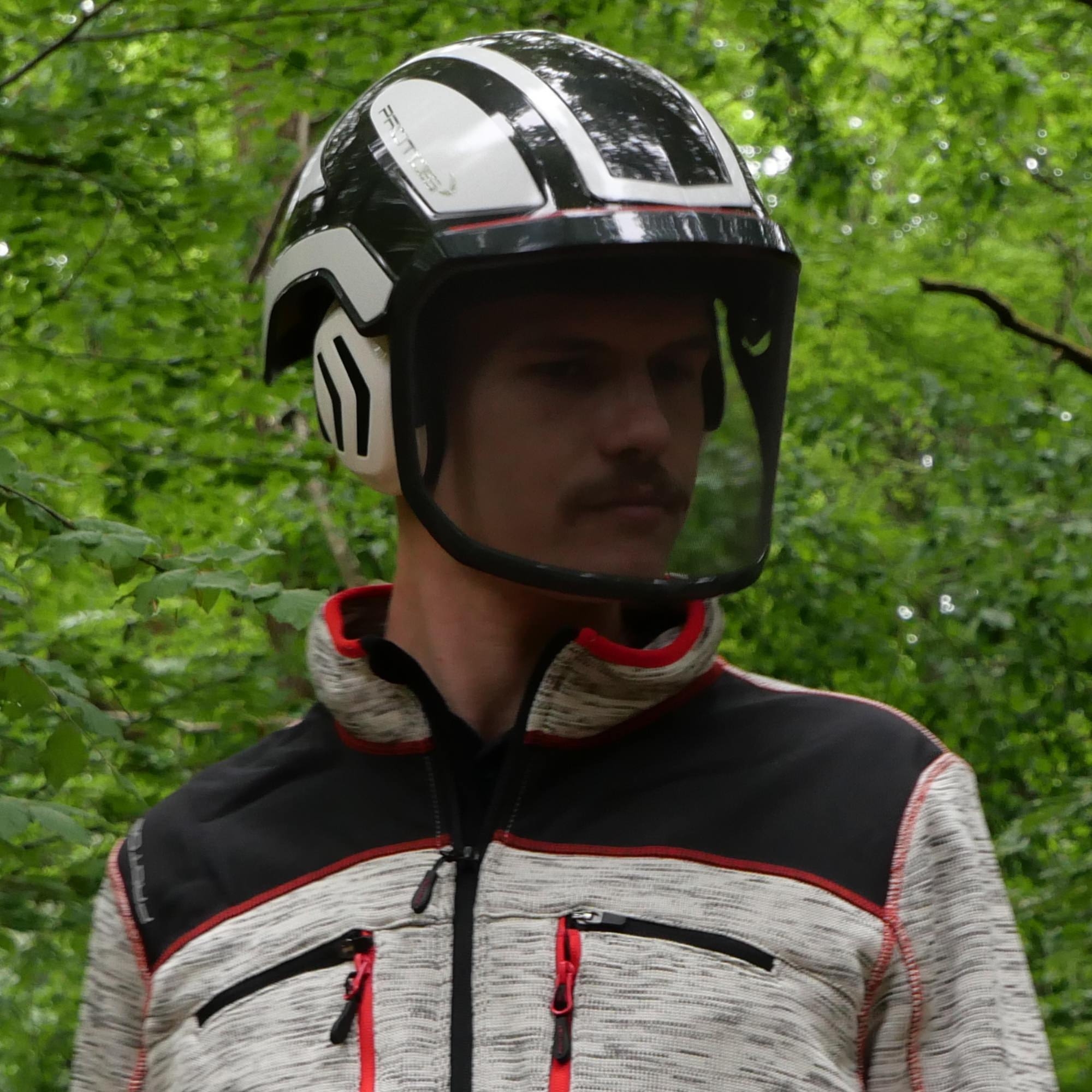 Le casque Protos Arborist Noir & Blanc est livré complet avec une visière F39 (maillage 39 trous/cm²), une jugulaire, un protège-nuque et des coquilles antibruit (SNR 27 dB) intégrées dans la structure. Tous les composants sont entièrement modulaires et peuvent être retirés, remplacés ou ajustés rapidement sans outil.