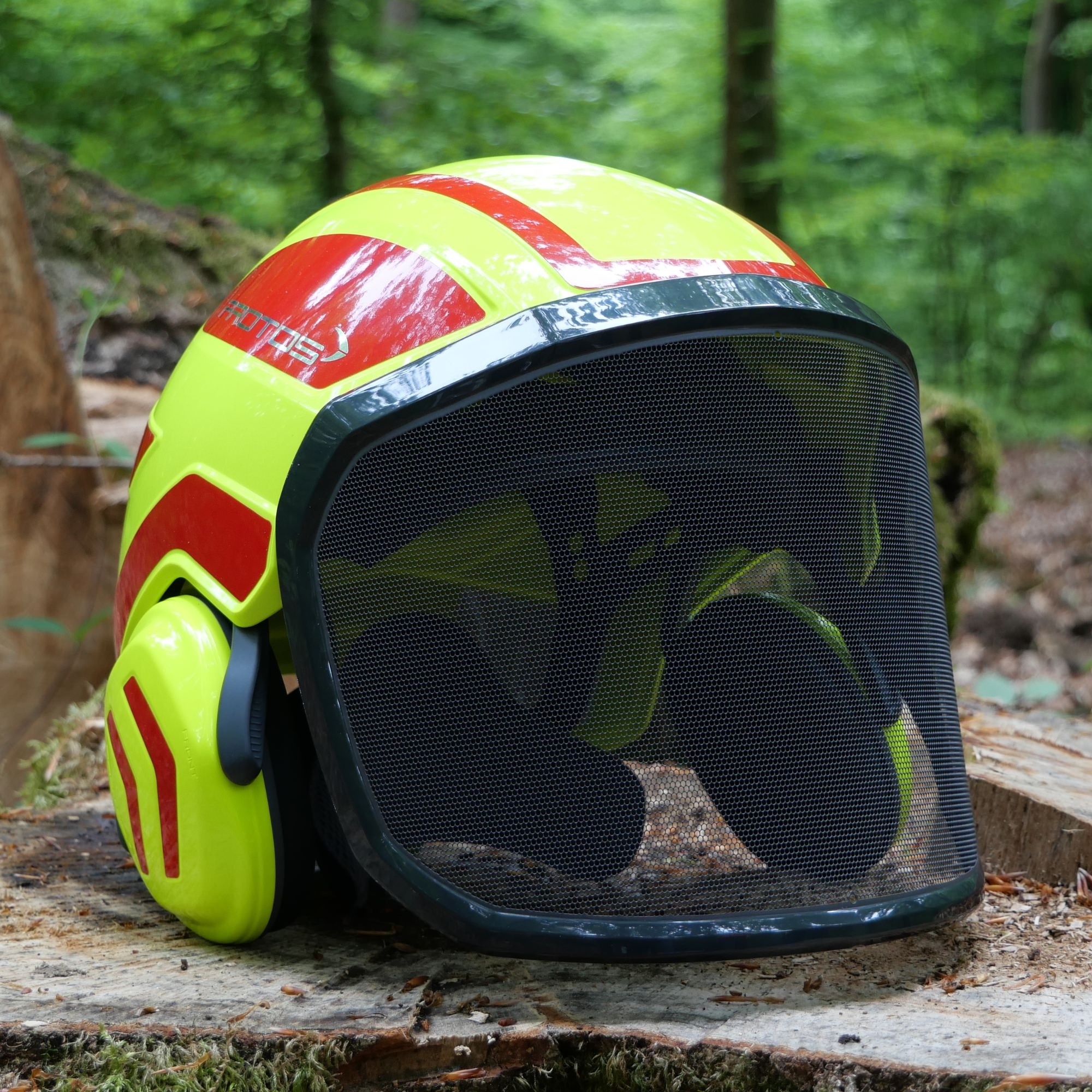 Le Protos Integral Forest Jaune Néon & Rouge est équipé de série avec une visière métallique F39, dont le maillage ultra-fin de 39 orifices/cm² combine visibilité panoramique et sécurité contre les débris forestiers. Les coquilles antibruit intégrées permettent une atténuation sonore de 26 à 27 dB, convenant parfaitement à l’utilisation de tronçonneuses ou broyeurs.