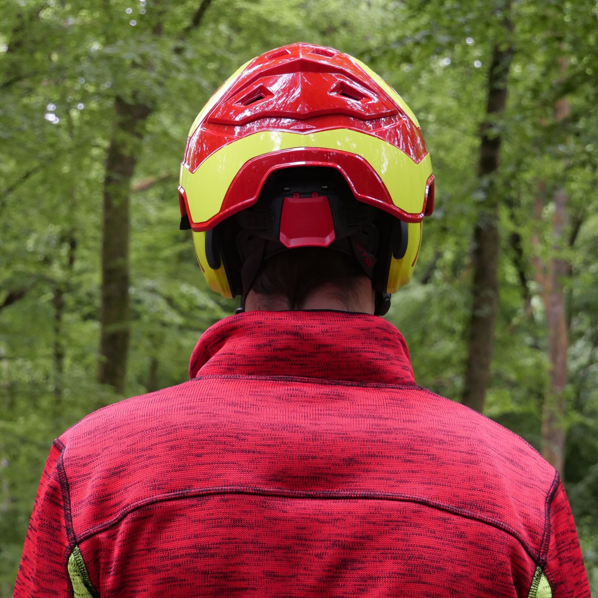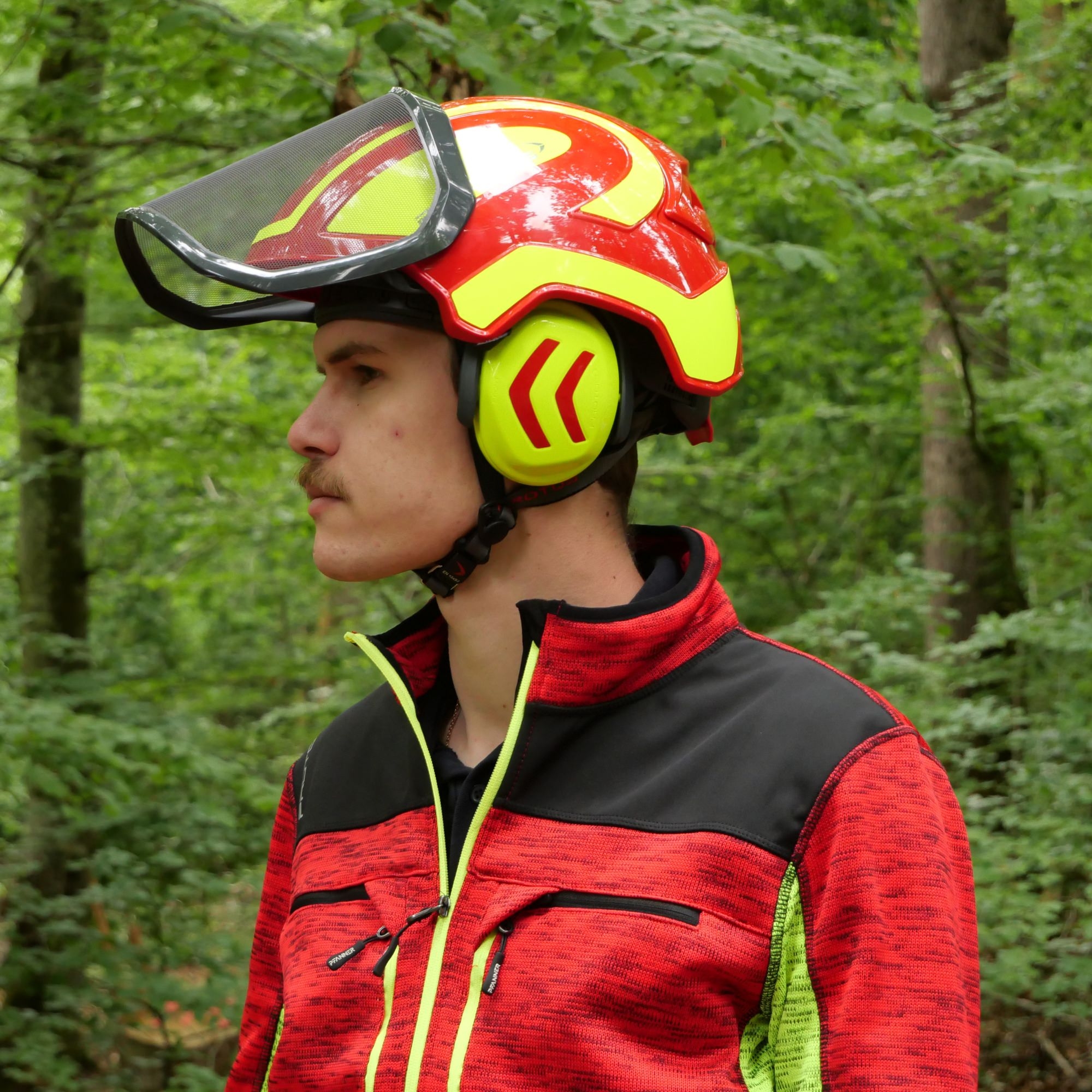 Protection forestière révolutionnaire Pfanner rouge/jaune haute visibilité. Système modulaire intégré avec protection nuque, visière F39 et coquilles antibruit (27dB). Technologie KlimaAIR pour ventilation optimale et confort maximal. Triple protection contre impacts (vertical/horizontal). Certifié EN 397/352-3/1731-S, pour périmètres 54-62cm.