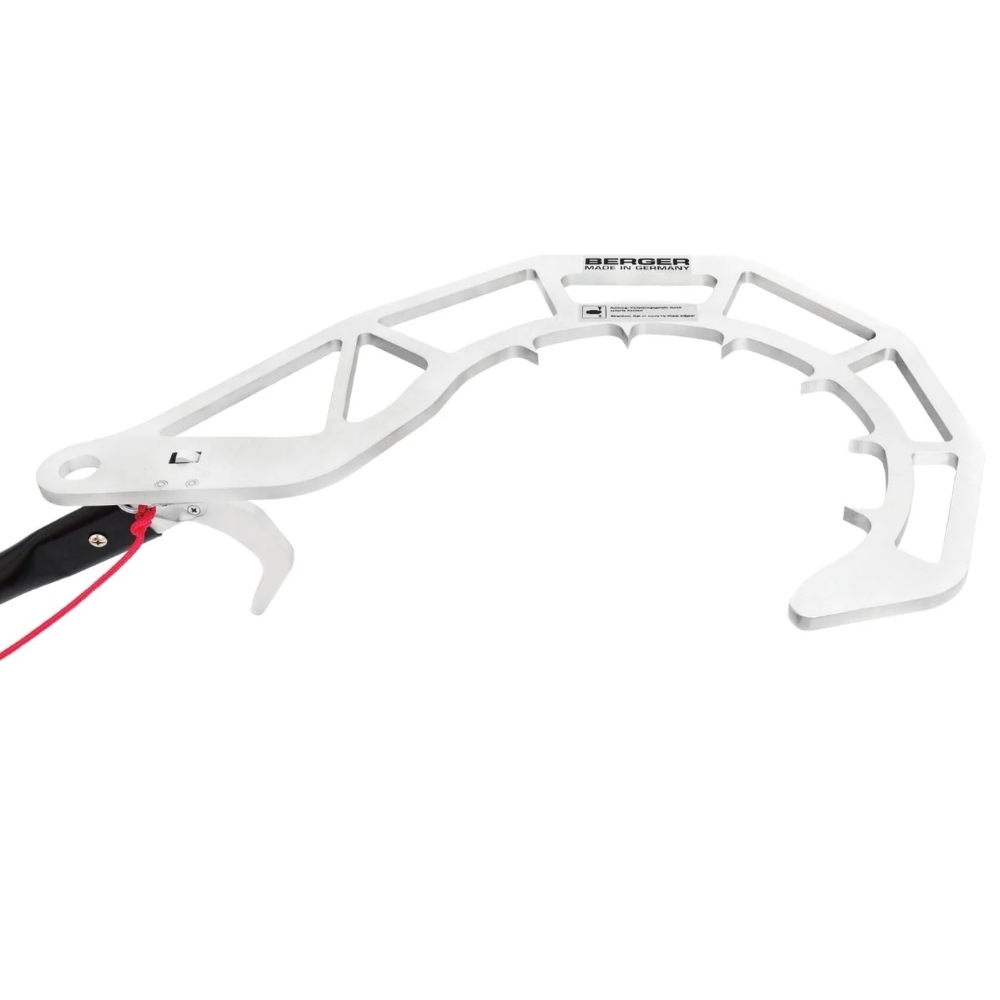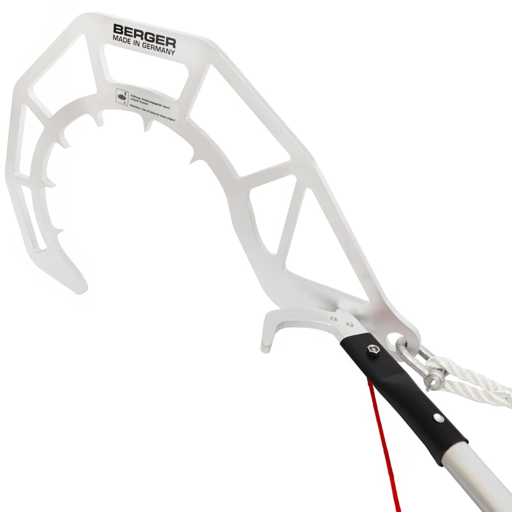 Les griffes de maintien internes garantissent une prise solide sur les sections à retirer, facilitant ainsi leur traction vers le bas. Sa conception robuste permet une utilisation fiable avec toutes les perches télescopiques BERGER de la gamme Arborapid, via une fixation sur le crochet universel.