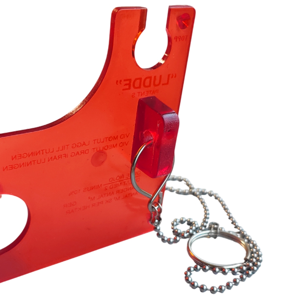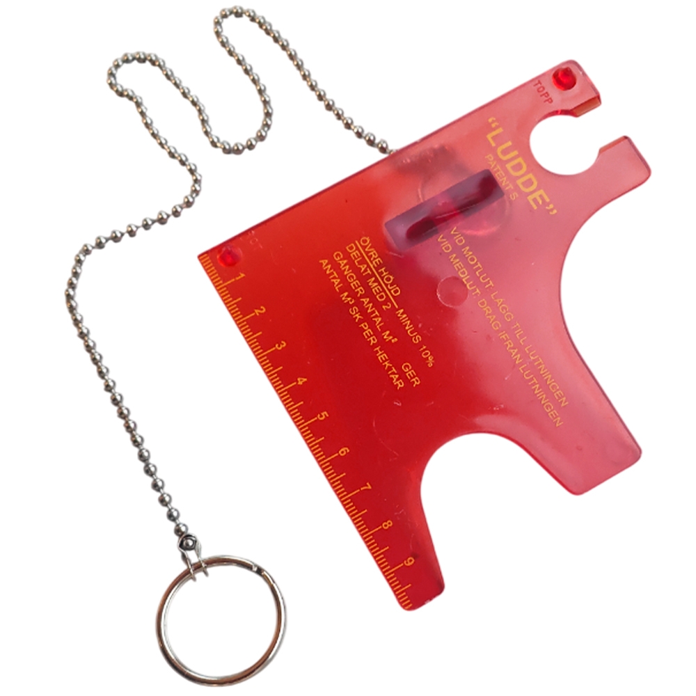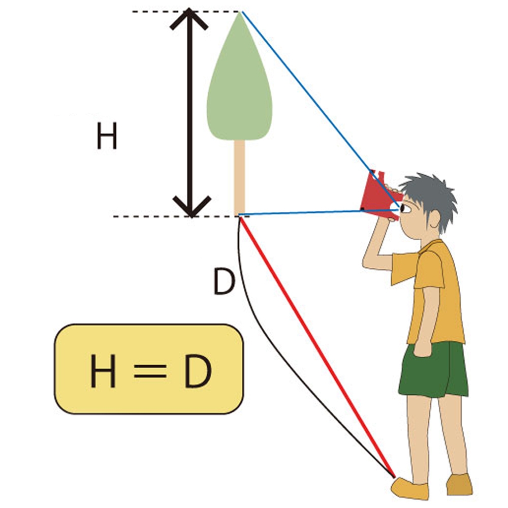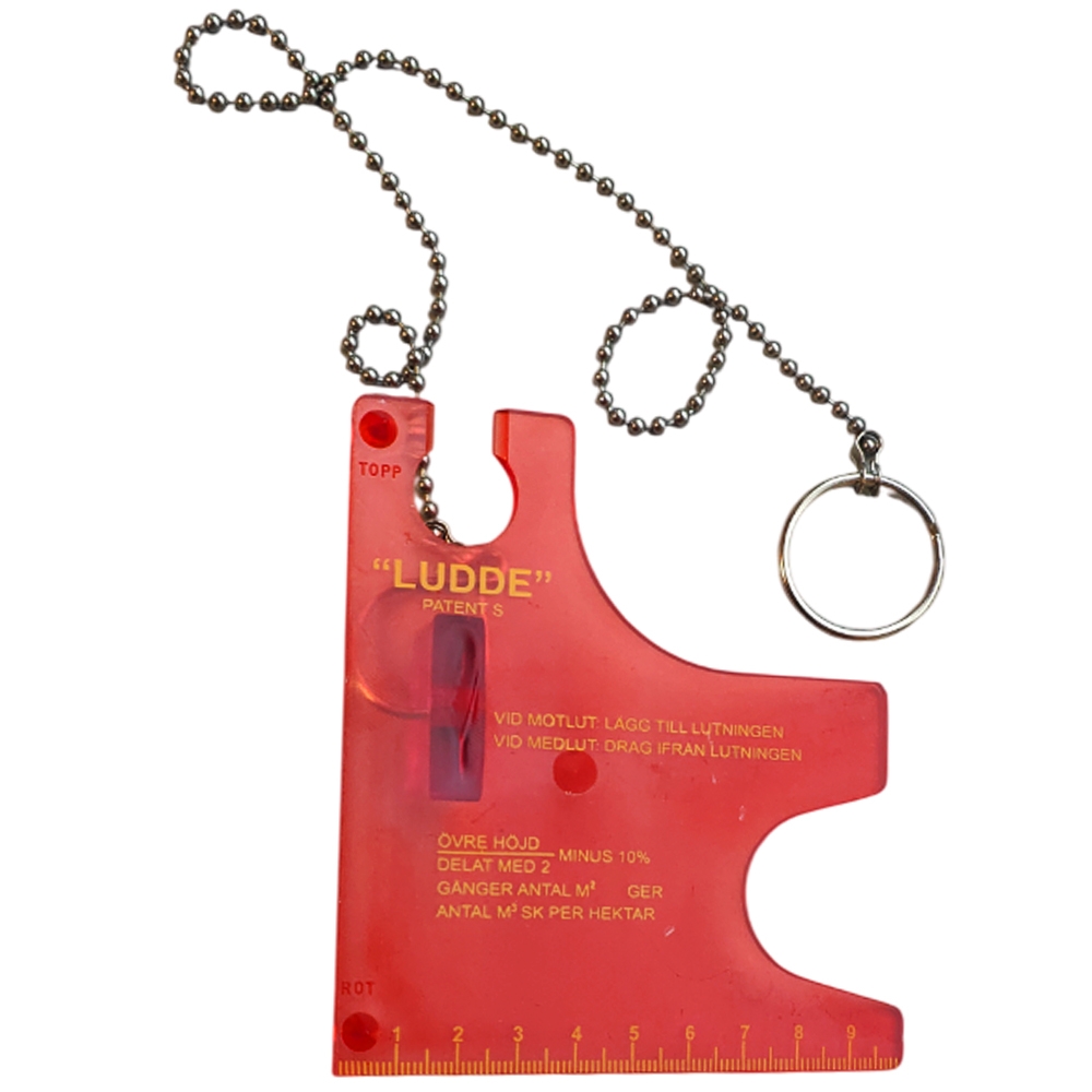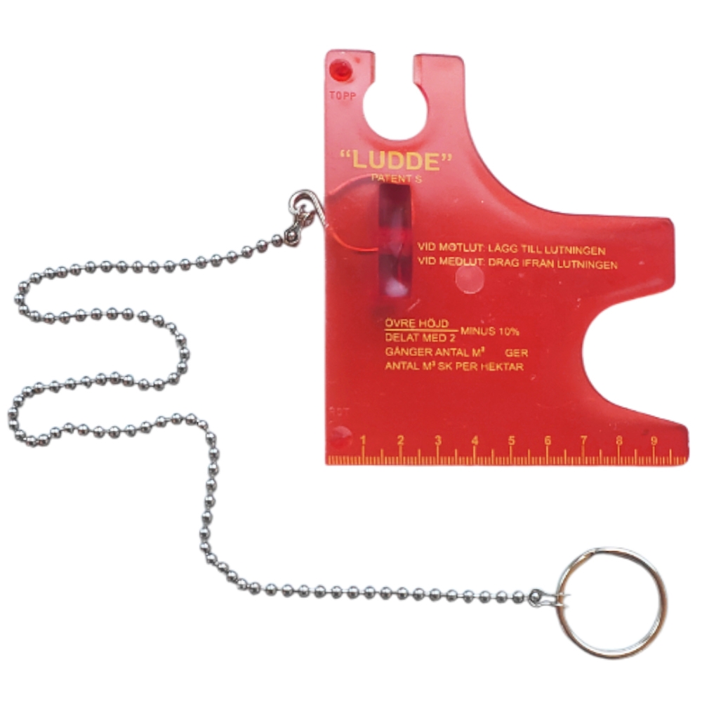 Facile à utiliser. On s'éloigne de l'arbre jusqu'à ce qu'on le voie entre les 2 points de mire. La hauteur de l'arbre est alors égale à la distance de l'arbre. La chaînette permet de l'utiliser comme relascope. Poids 50g. Le système télescopique à chaînette : c'est un moyen simple d'estimation de la surface terrière d'un peuplement forestier (méthode statistique). Une encoche tenue à une distance fixe de l'oeil (chaînette tendue) détermine un angle constant. En faisant un tour d'horizon complet, on compte tous les arbres dont le diamètre apparent est plus grand que l'encoche (les arbres tangents sont comptés pour ½).