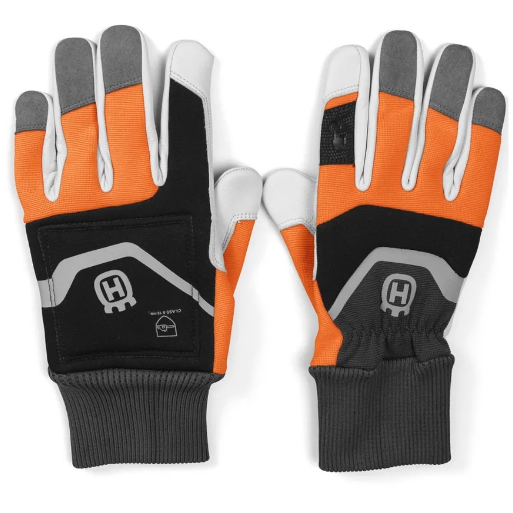 Gants en cuir pour tronçonneuse avec protection anticoupure Classe 0 (16 m/s) main gauche. Paume en cuir de chèvre résistante, dos en spandex laminé et articulations en néoprène pour un confort optimal. Index tactile compatible écran. Renfort au pouce, coutures confortables, poignet tricoté. Conformes EN 388:2016 et EN ISO 11393-4:2019.