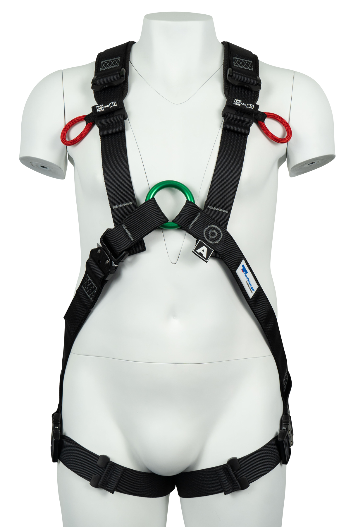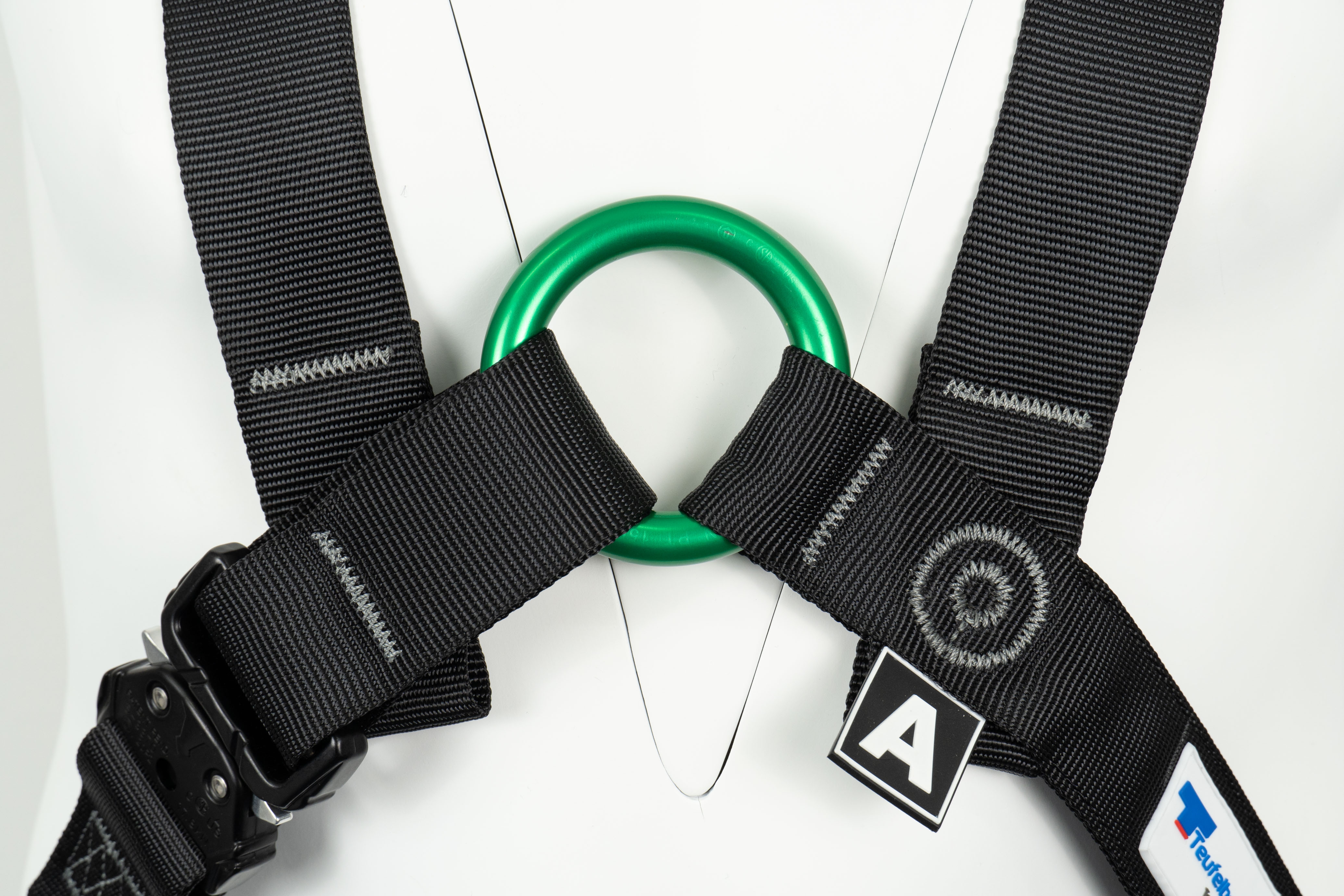 Deux boucles textiles rouges, situées sur le haut du harnais, permettent de ranger les connecteurs de longe lorsqu’ils ne sont pas utilisés. Résistantes jusqu’à 5 kg chacune, elles sont utiles pour organiser son matériel, mais ne doivent en aucun cas être utilisées comme point d’ancrage pour des EPI. Comme toujours avec les harnais TEUFELBERGER, un marquage clair vient rappeler les fonctions précises de chaque boucle ou point d’attache, pour éviter les erreurs d’usage.