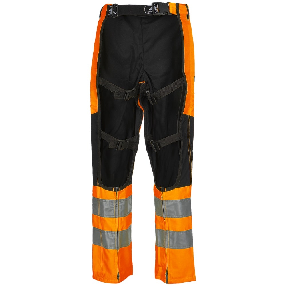 Leur protection avant à six couches offre une sécurité efficace contre les coupures de tronçonneuse, tout en préservant une bonne liberté de mouvement. Le tissu principal, un mélange 80 % polyester et 20 % coton d’environ 200 g/m², est déperlant et durable, conçu pour résister aux projections et aux conditions forestières modérées.