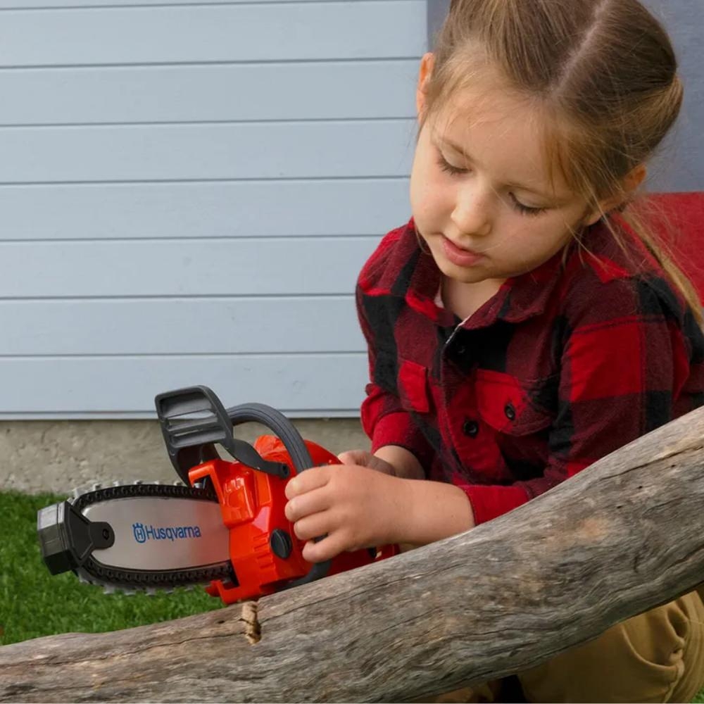 Réplique fidèle de la tronçonneuse Husqvarna 440E pour les enfants dès 3 ans. Avec sons réalistes, chaîne rotative en plastique et piles incluses, ce jouet robuste et sécurisé permet de jouer comme les grands en toute confiance, à l’intérieur comme à l’extérieur.
