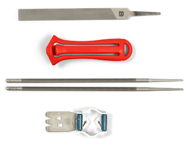 Ce kit d'affûtage comporte un manche pour les limes, un calibre-combiné (gabarit de lime et jauge de profondeur), une lime ronde et une lime plat