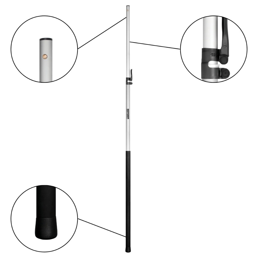 Fabriquée en aluminium avec revêtement anticorrosion, cette perche est conçue pour résister aux conditions extérieures les plus exigeantes. Les deux tubes coulissants s’assemblent parfaitement grâce à un double verrouillage en métal, combinant leviers robustes et écrous autobloquants, évitant tout jeu ou flexion excessive.
