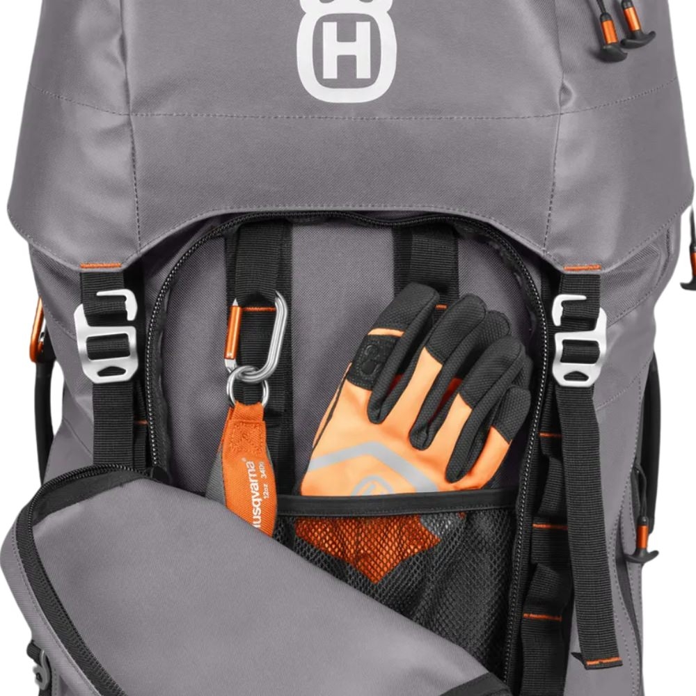Sac à dos Husqvarna 70L, conçu pour transporter tout votre matériel d’escalade ou de travail en hauteur. Sa conception robuste, ses bretelles ergonomiques et son accès par le haut et le côté en font un allié fiable et confortable sur le terrain. Intérieur bien organisé avec poches multiples, sangles à boucles et emplacement pour trousse de secours. Fond renforcé et tissu imperméable pour une protection optimale en toutes conditions.