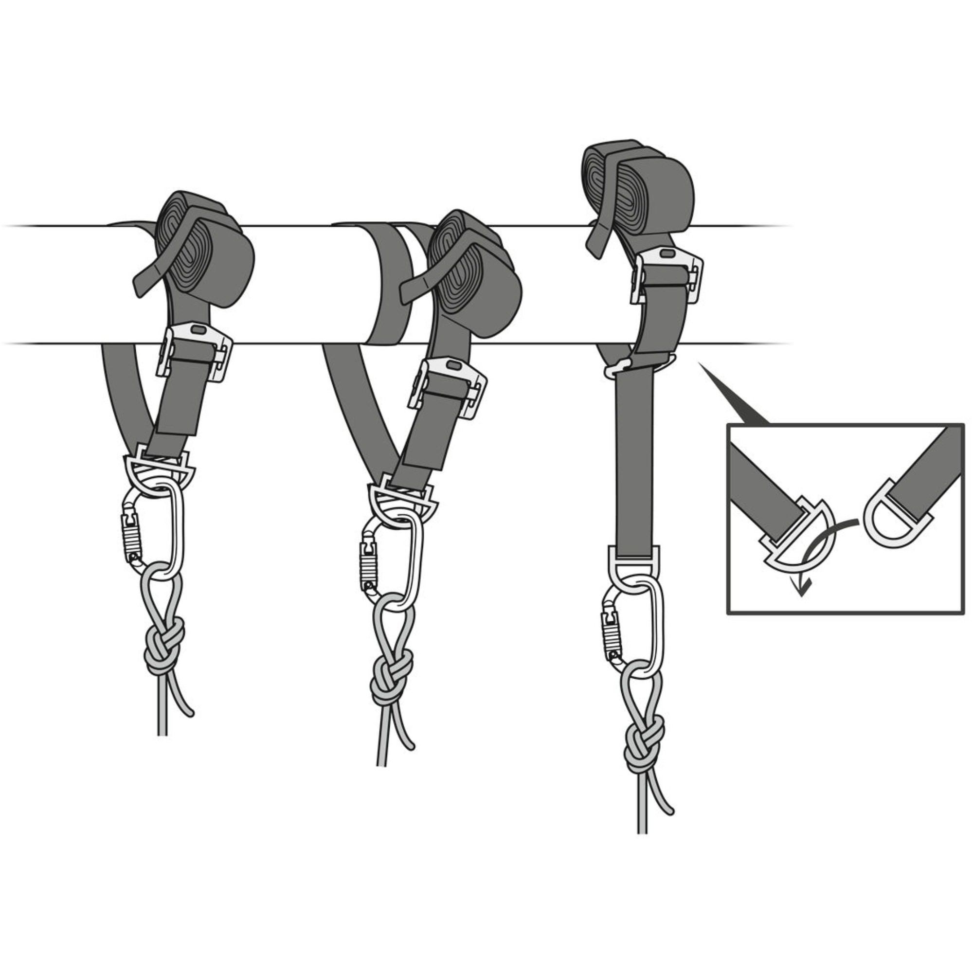 La boucle de réglage coulissante permet un ajustement fluide et sécurisé de la longueur de sangle, ce qui la rend particulièrement utile lorsqu’il est nécessaire de travailler avec des structures de tailles variables. Un système de rangement par velcro maintient la partie non utilisée de la sangle enroulée de façon propre et compacte, évitant les accrochages ou le flottement inutile.