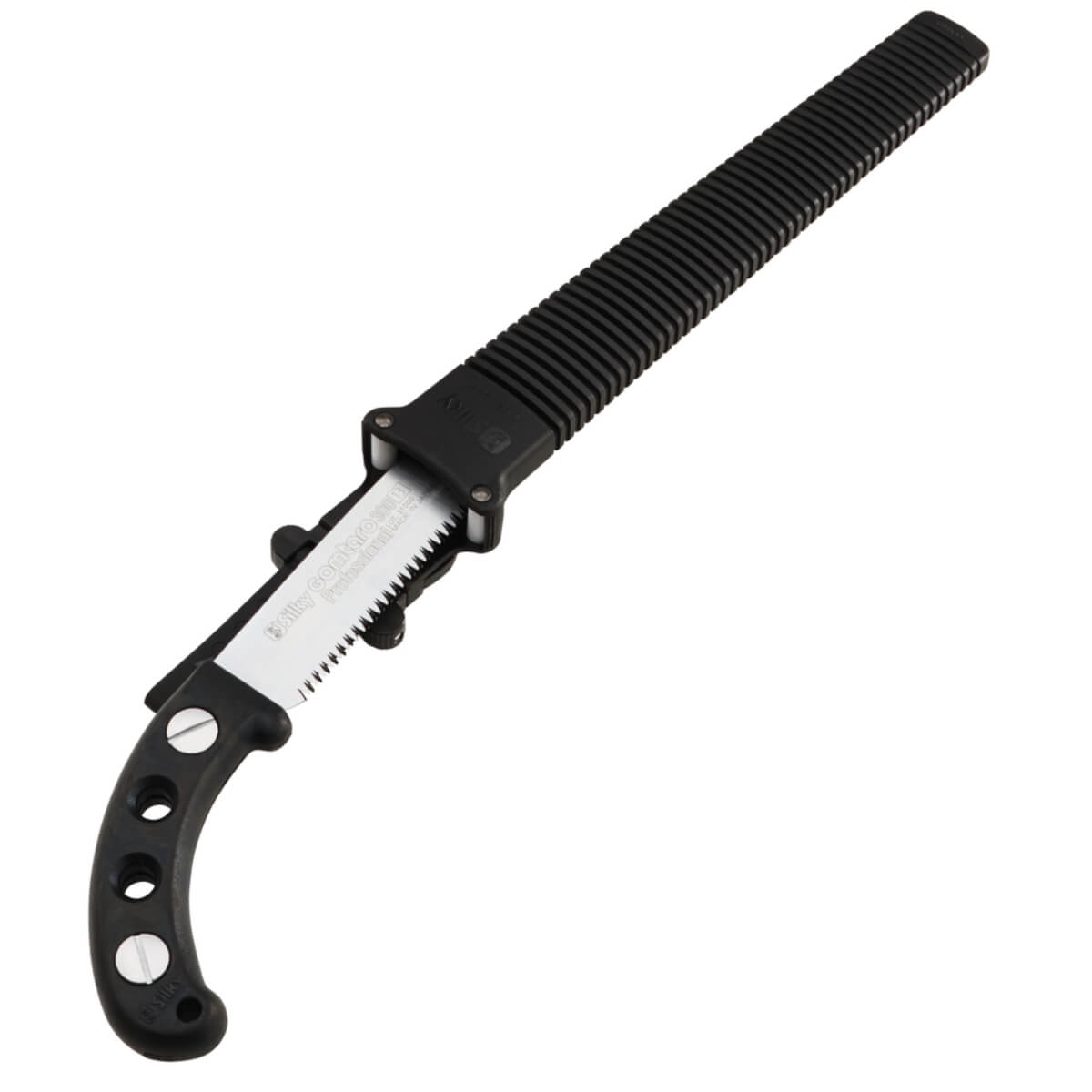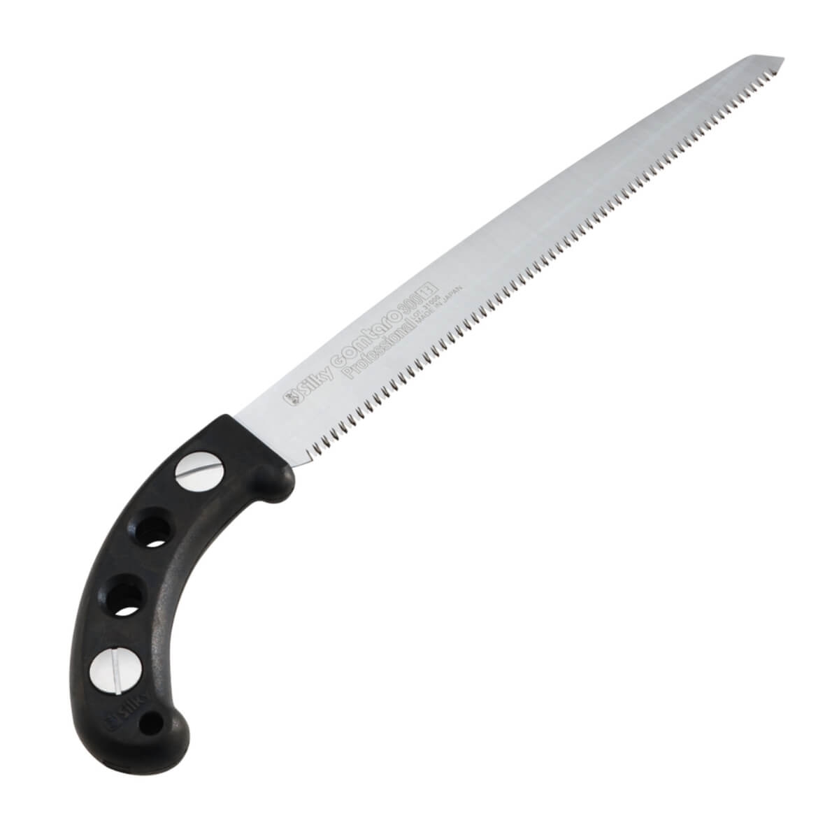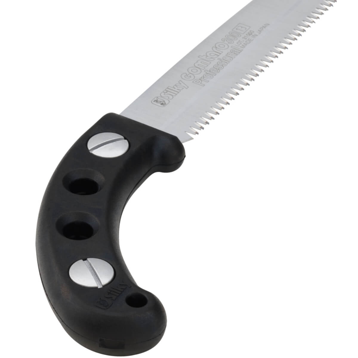 Pour bois sec. Longueur de la lame 30 cm, longueur totale avec manche : 45 cm. Etui plastique avec passant pour port sur ceinture. 13 dents par 3cm. Poids 320g