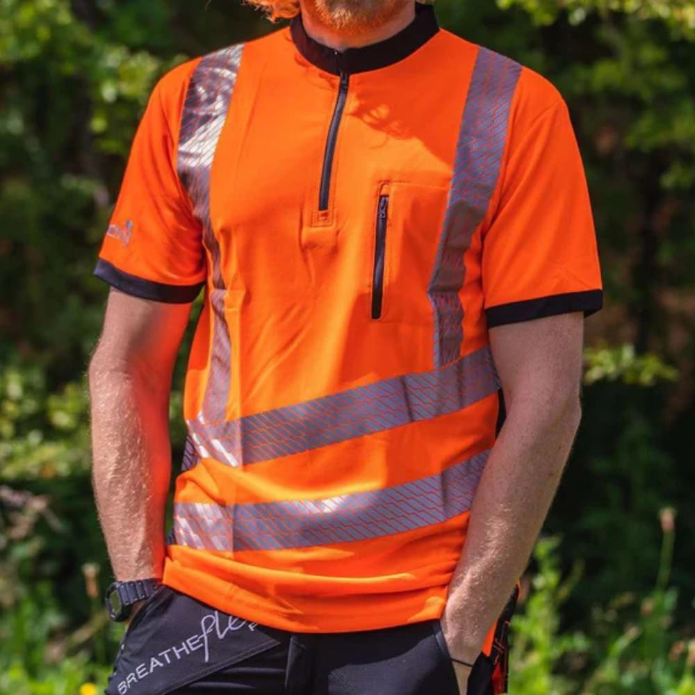 Ce T-shirt est fabriqué à partir d’un tissu technique respirant et à séchage rapide qui garantit un confort permanent, même lors d’efforts prolongés ou par temps chaud. Sa matière légère évacue efficacement l’humidité et permet de rester au sec tout au long de la journée. Les bandes réfléchissantes stretch-flex, appliquées par procédé thermique, renforcent la visibilité sans compromettre la souplesse du vêtement, offrant ainsi une liberté de mouvement totale.
