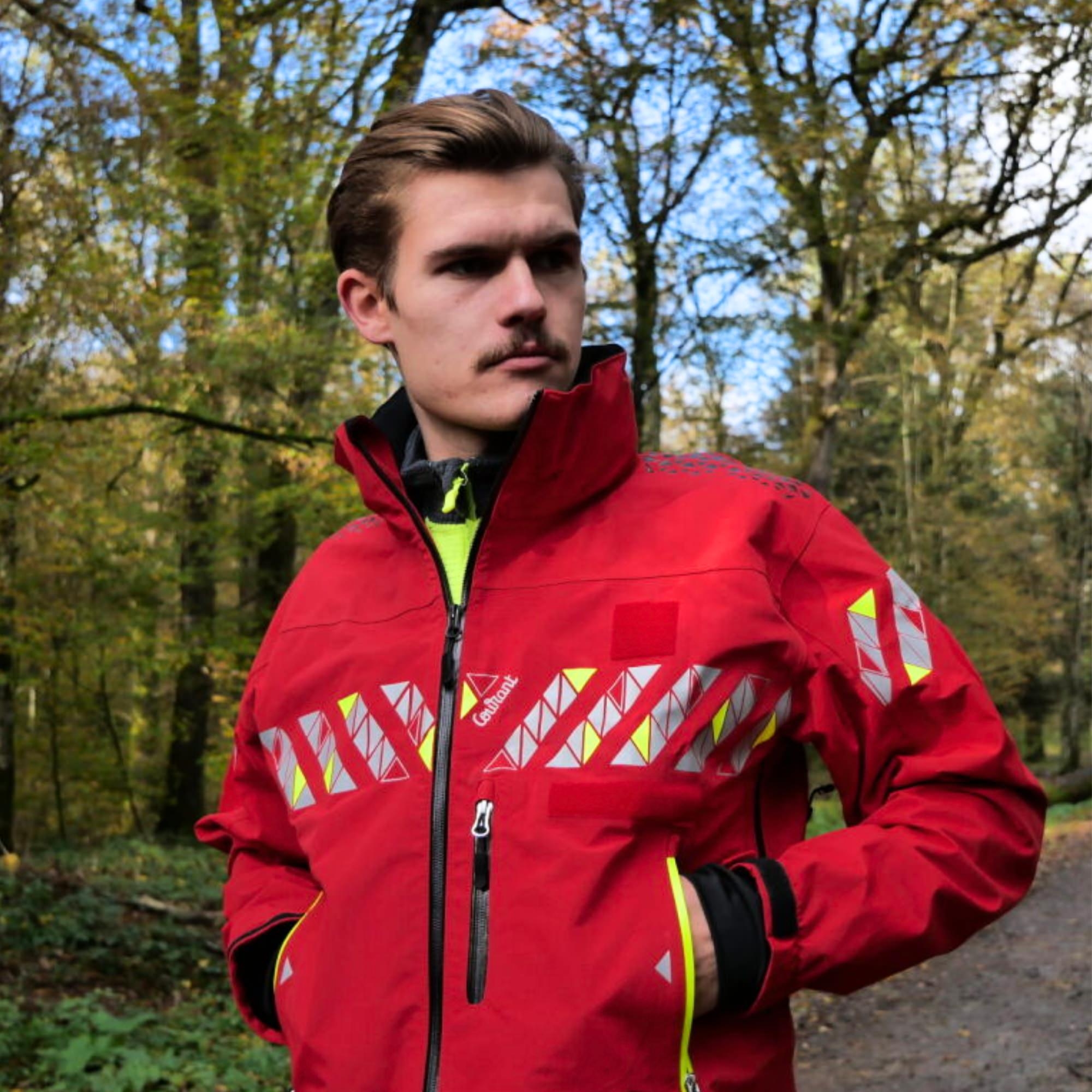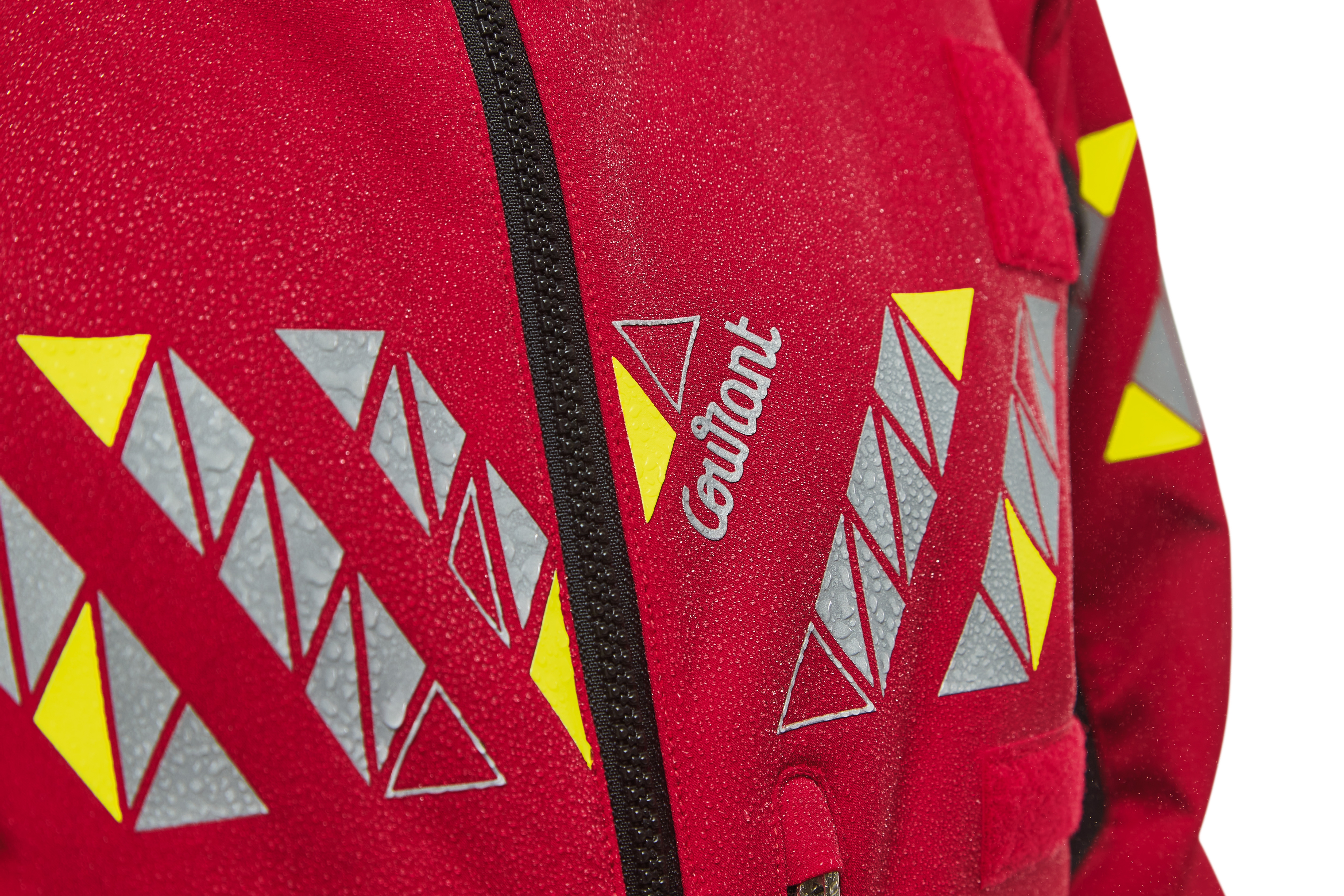La sérigraphie, avec du jaune et du blanc mélangé, située sur le torse, les épaules et le dos est réfléchissante et vous permet d’être visible même en cas de conditions météorologiques défavorables. Elle donne un design innovant à la veste.